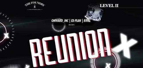 REUNION, acara musik yang diselenggarakan oleh The Foundry No.8 dan Onward_Inc, Ex-Plan dan Rival akan menghadirkan penampilan spesial dari Erco, Applez, Valent, Reza D.S, Ziskey dan Babers. Host Djs oleh Fendy, Gema Putrawan, Tanzel dan Putri Danizar. Serta didukung oleh MC Ke’renAzuba dan MC Chris. A.