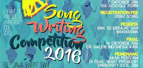 Song Writing Competiton 2016 yang diselenggarakan oleh President University Student Union, telah dimulai pendaftarannya sejak tanggal 27 Juli 2016 sampai 7 Oktober 2016 dan akan menyelanggarakan final pada hari Jumat, tanggal 14 Oktober 2016, bertempat di Galeri Indonesia Kaya, Jakarta.
