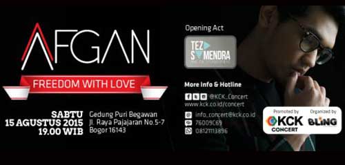 Konser Afgan “Freedom With LOVE” di Bogor ini akan diselenggarakan pada hari Sabtu, tanggal 15 Agustus 2015, bertempat di Grand Ballroom Puri Begawan Bogor, jam 19.00 WIB sampai selesai.