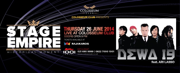 Ada acara menarik buat penggemar Dewa 19. Ya, 26 Juni 2014 mendatang, bertempat di Colosseum Club, Jl. Kunir No.7, Kota Tua, Jakarta Barat, Dewa 19 akan manggung bareng Ari Lasso. Harga tiket masuk sebesar Rp. 250rb sudah dapat dipesan di tiket box favorit kamu sekarang juga. (ymn)