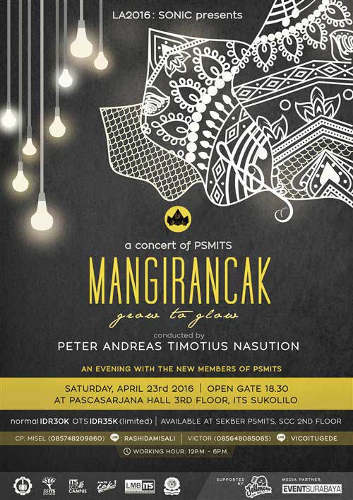 ITS Student Choir mempersembahkan sebuah konser dari PSMITS yang bertajuk Mangirancak “Grow to Glow”, dengan conducted oleh Peter Andreas Timotius Nasution.