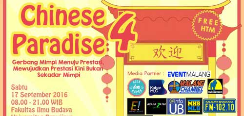 Chinese Paradise 4 bertajuk Gerbang Mimpi Menuju Prestasi, Mewujudkan Prestasi Kini Bukan Sekedar Mimpi persembahan dari Mahasiswa Sastra Cina Fakultas Ilmu Budaya Universitas Brawijaya, akan digelar pada hari Sabtu, tanggal 17 September 2016, jam 08.00 sampai 21.00 WIB, bertempat di Fakultas Ilmu Budaya Universitas Brawijaya, Malang.
