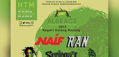 AlbumBaru.Com — Gelaran Musik ALSEACE 2017 bertema Negeri Gotong Royong merupakan acara hiburan persembahan dari Sekolah Islam Al Azhar BSD, yang akan digelar pada hari Minggu, tanggal 5 Maret 2017, bertempat di Di Parkir Selatan Ocean Park BSD, Tangerang.