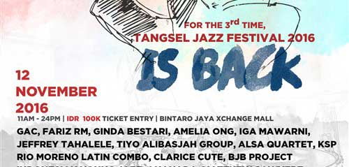 Tangsel Jazz Festival 2016 akan segera digelar pada hari Sabtu, tanggal 12 November 2016, jam 11.00 sampai 24.00 WIB, bertempat di Mall Bintaro Xchange, Tangerang Selatan.