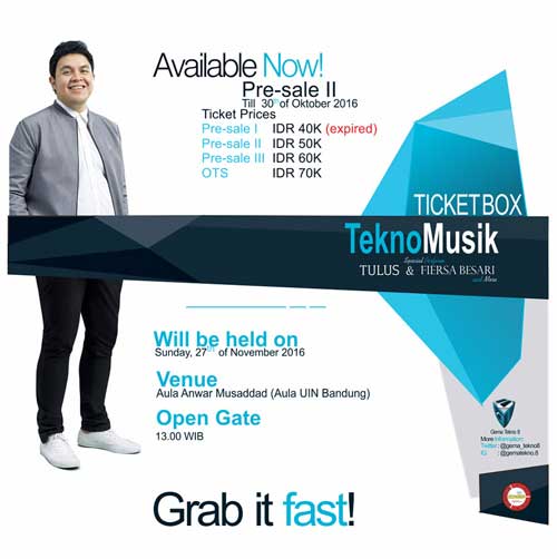Tekno Musik “Sewindu Menuju Kedewasaan” diselenggarakan pada hari Minggu, tanggal 27 November 2016, jam 13.00 WIB sampai selesai, bertempat di Gedung Anwar Musaddad UIN Sunan Gung Djati Bandung.